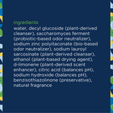 Ingredientes: agua, decil glucósido (limpiador de origen vegetal), fermento de saccharomyces (neutralizador de origen probiótico), poliitaconato de sodio y zinc (neutralizador de olores de origen biológico), lauroil sarcosinato de sodio (limpiador de origen vegetal), etanol (agente de secado de origen vegetal). ), d-limoneno (potenciador del aroma de origen vegetal), ácido cítrico (equilibra el pH), hidróxido de sodio (equilibra el pH), benzoisotiazolinona (conservante), fragancia natural - Este producto está diseñado y producido en una instalación familiar registrada por la FDA y la EPA ubicada en la costa este de los Estados Unidos que cumple con los estándares cGMP.